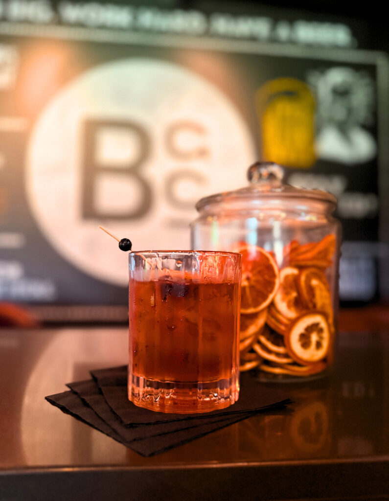 Bitters are needed to balance out the sweetness. Angostura or orange bitters are the most common, but the BGC Bulletproof Old Fashioned has dashes of Cherry vanilla bark bitters that give it a whole new flavor profile.